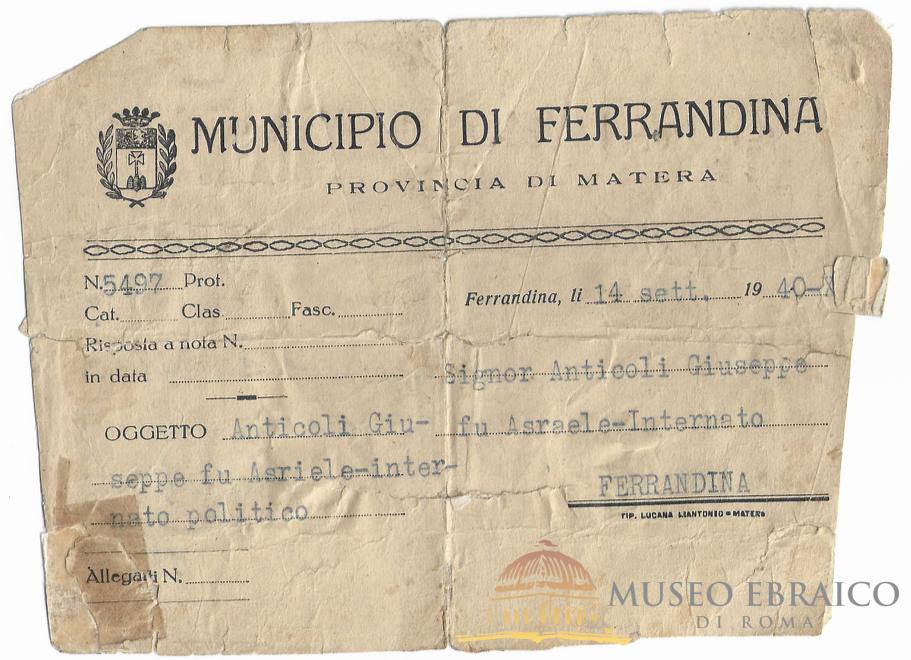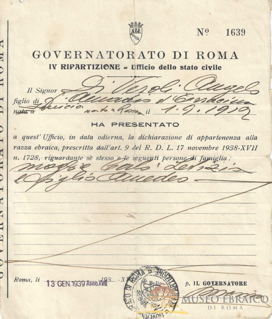 Dichiarazione di appartenenza alla razza ebraica di Angelo Di Veroli