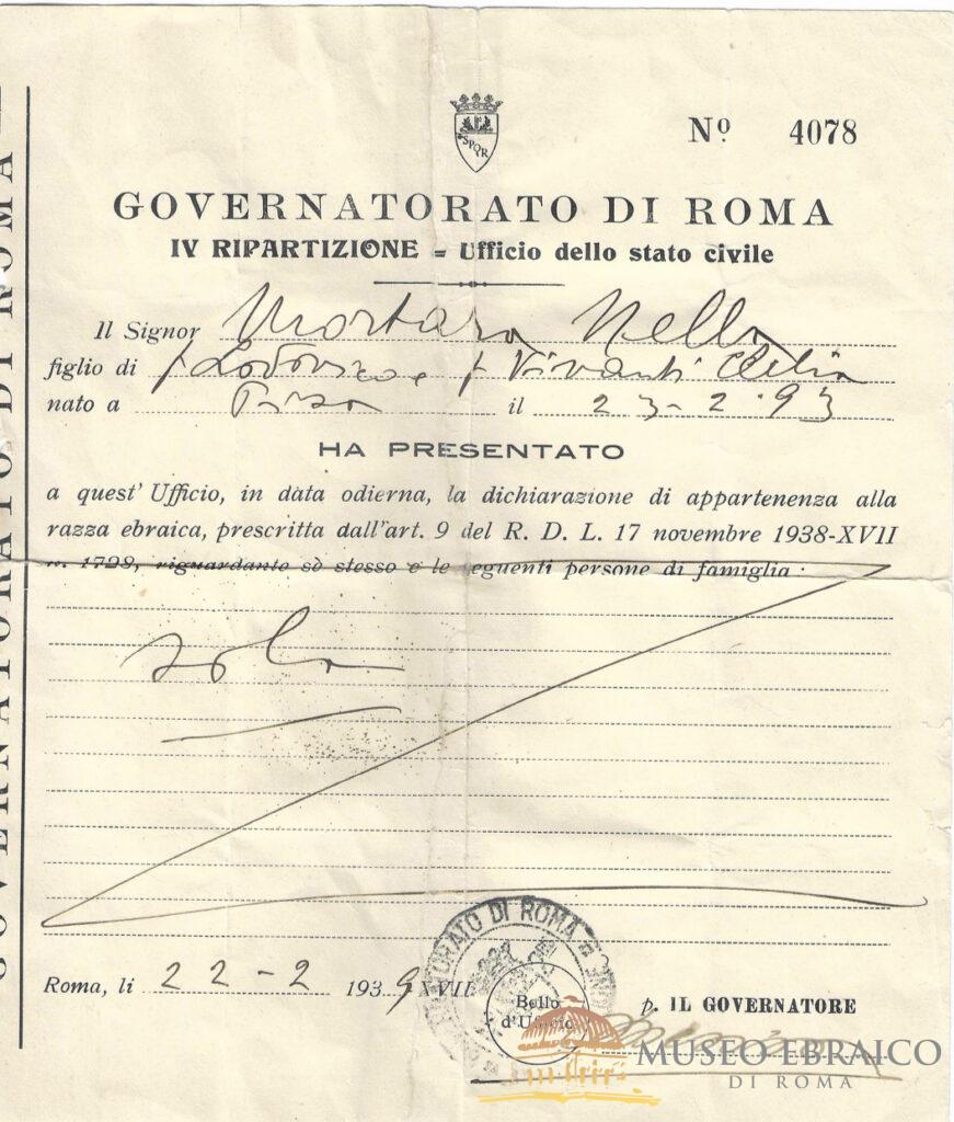 Dichiarazione di appartenenza alla razza ebraica di Nella Mortara