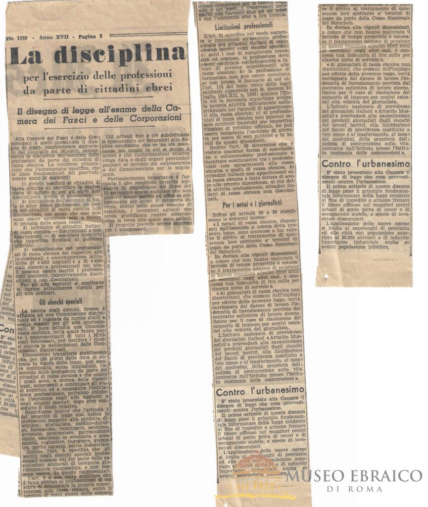 Articolo di giornale del 1939 sulla disciplina per l’esercizio delle professioni da parte degli ebrei