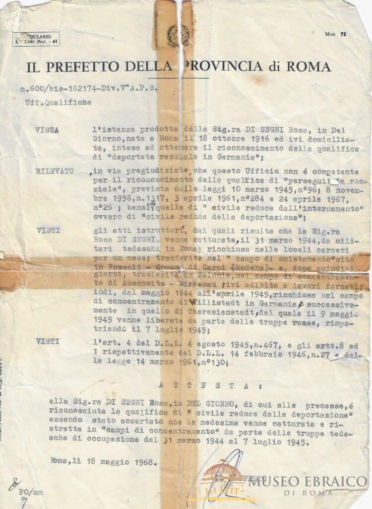 Documento del Prefetto della Provincia di Roma relativo alla richiesta di Rosa Di Segni per il riconoscimento di “deportata razziale in Germania”, 18 maggio 1968