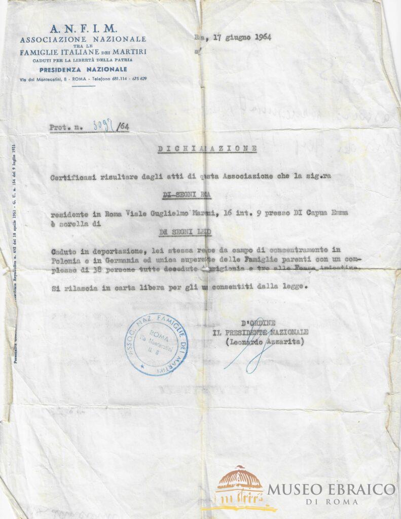 Dichiarazione rilasciata a Rosa Di Segni dall’A.N.F.I.M, 17 giugno 1964