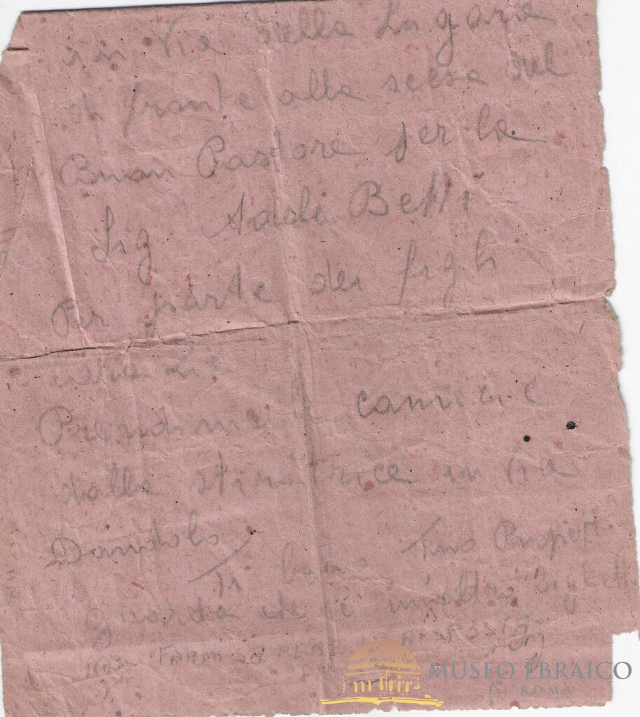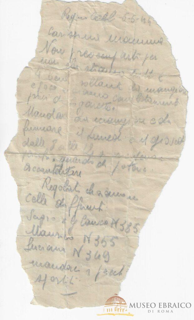 Lettera su pezzo di carta mandata da Regina Coeli dai fratelli Anticoli, 6 maggio 1944