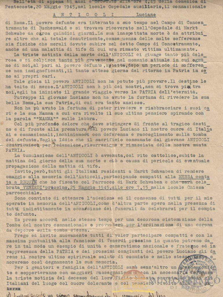 Lettera del Segretario della Commissione Interministeriale con l’attestazione della morte di Liciano Anticoli del 20 maggio 1945 a liberazione già avvenuta