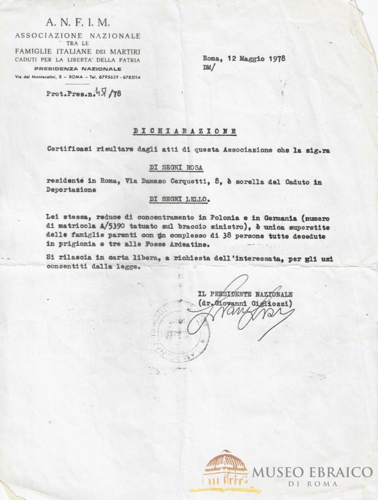 Dichiarazione rilasciata a Rosa Di Segni dall’A.N.F.I.M, 12 Maggio 1978
