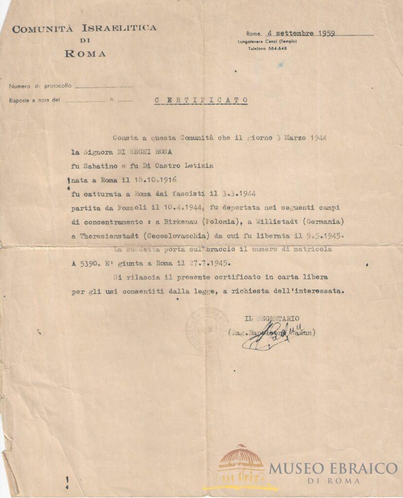 Certificato rilasciato a Rosa Di Segni dalla Comunità Israelitica di Roma, 4 settembre 1959